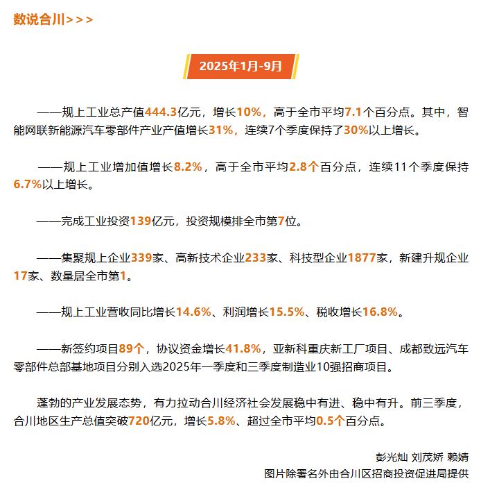 近年来,合川区大力实施工业倍增计划,迭代构建“2446”产业体系。今年1-3季度“两主四特”实现产值316.9亿元、增长15.8%,集群发展的态势日益显现。其中,智能网联新能源汽车零部件产业产值连续7个季度保持了30%以上增长,火锅食材、现代中药、摩托车、日用玻璃产值保持8%以上增速。目前,“两主四特”集聚规上企业225家,占规上企业总数67.8%,产值占规上总产值70%以上。